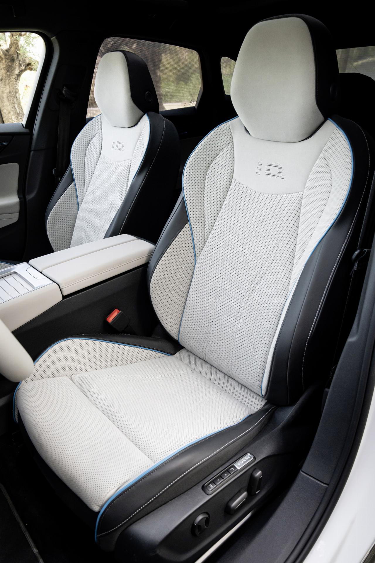 Im Innenraum herrschen großzügige Platzverhältnisse. Der Fahrer blickt auf minimalistische Anzeigen, die nur noch eine Nebenrolle spielen, denn dank des Head-up Displays liegen alle Informationen im Sichtfeld, so dass der Blick auf die Straße konzentriert bleiben kann. In der Abteilung Wohlfühlatmosphäre spendierten die Wolfsburger Kreativen dem ID 7 eine Ambientebeleuchtung, die insgesamt zehn Farben umfasst. Gegen Aufpreis sind auch 30 Farben lieferbar. Die Unterhaltung liefert ein optionales 700 Watt starkes Soundsystem von Harman Kardon mit 14 Lautsprechern. Abgerundet wird das Ambiente durch neu entwickelte Sitze, die eine angenehme Belüftung oder eine ebenfalls willkommene Massagefunktion bieten. Die neuen Sitze erfüllen die Parameter der Aktion Gesunder Rücken.