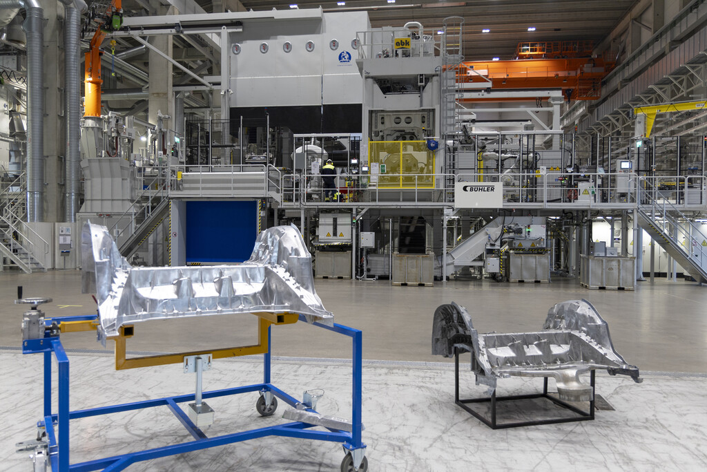 Die guten Reichweitenwerte sind unter anderem auch Neuerungen bei der Produktion des EX60 geschuldet. So wird die Batterie als tragendes Teil in das Chassis integriert, und beim hinteren Unterboden beschreiten die Schweden neue Wege, um Produktionskosten und Gewicht einzusparen. Der hintere Unterboden wird in Göteborg im sogenannten Mega-Casting-Verfahren hergestellt. Mit dieser Technik werden Karosserieteile, die bisher in mehreren und zeitaufwendigen Schritten produziert wurden, in einem Teil gegossen. Die vom Schweizer Spezialisten Bühler gelieferte Anlage arbeitet mit Schließkräften von 8400 Kilogramm und kann innerhalb weniger Millisekunden mehr als 200 Kilo flüssiges Aluminium verarbeiten. Das Ergebnis ist ein einzelnes großes Bauteil, das direkt weiterverarbeitet werden kann. Gleichzeitig reduziert sich das Gewicht und die Steifigkeit wird verbessert. Aktuell werden ausschließlich die hinteren Elemente des EX60 so gefertigt. (aum)