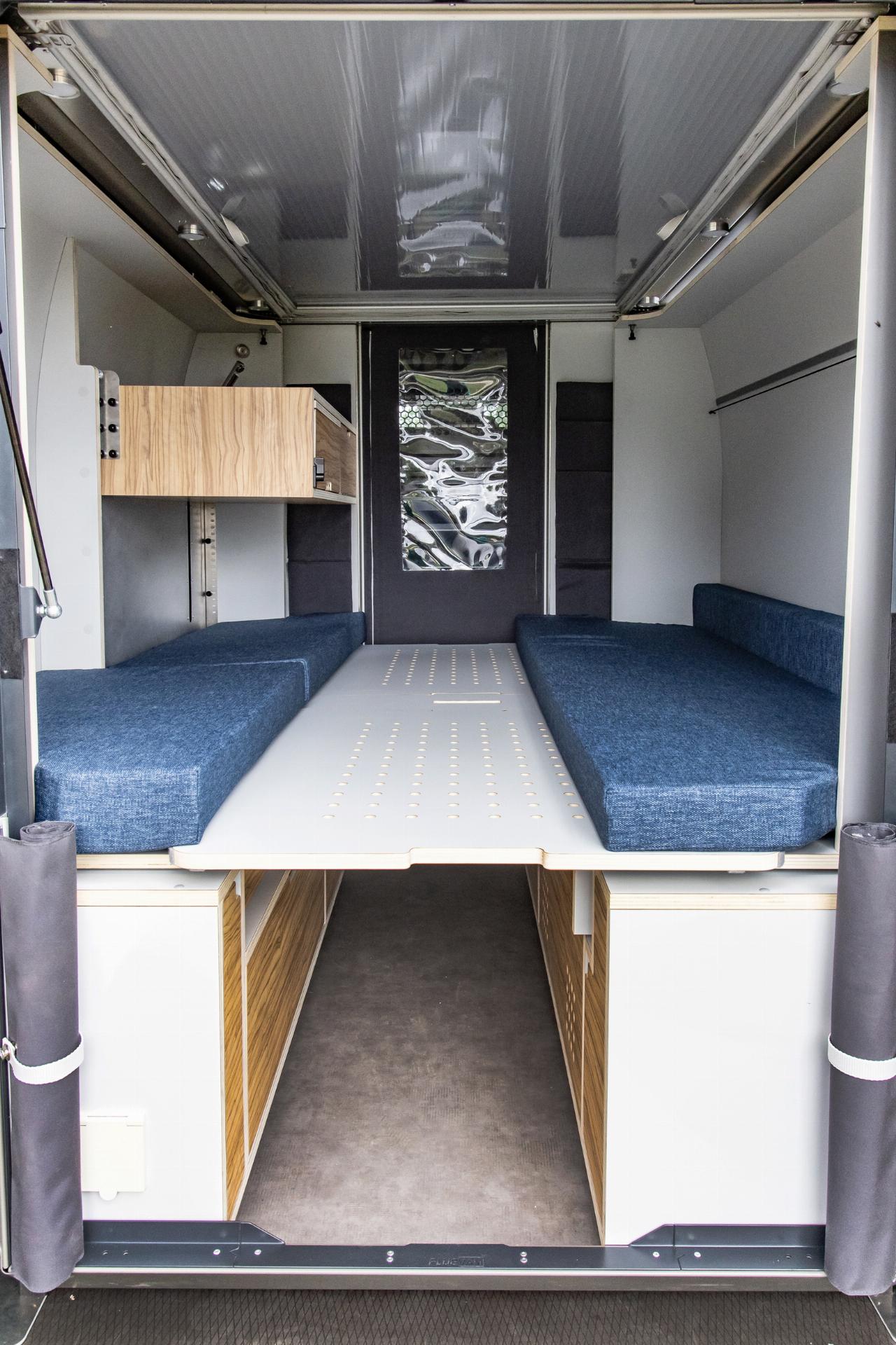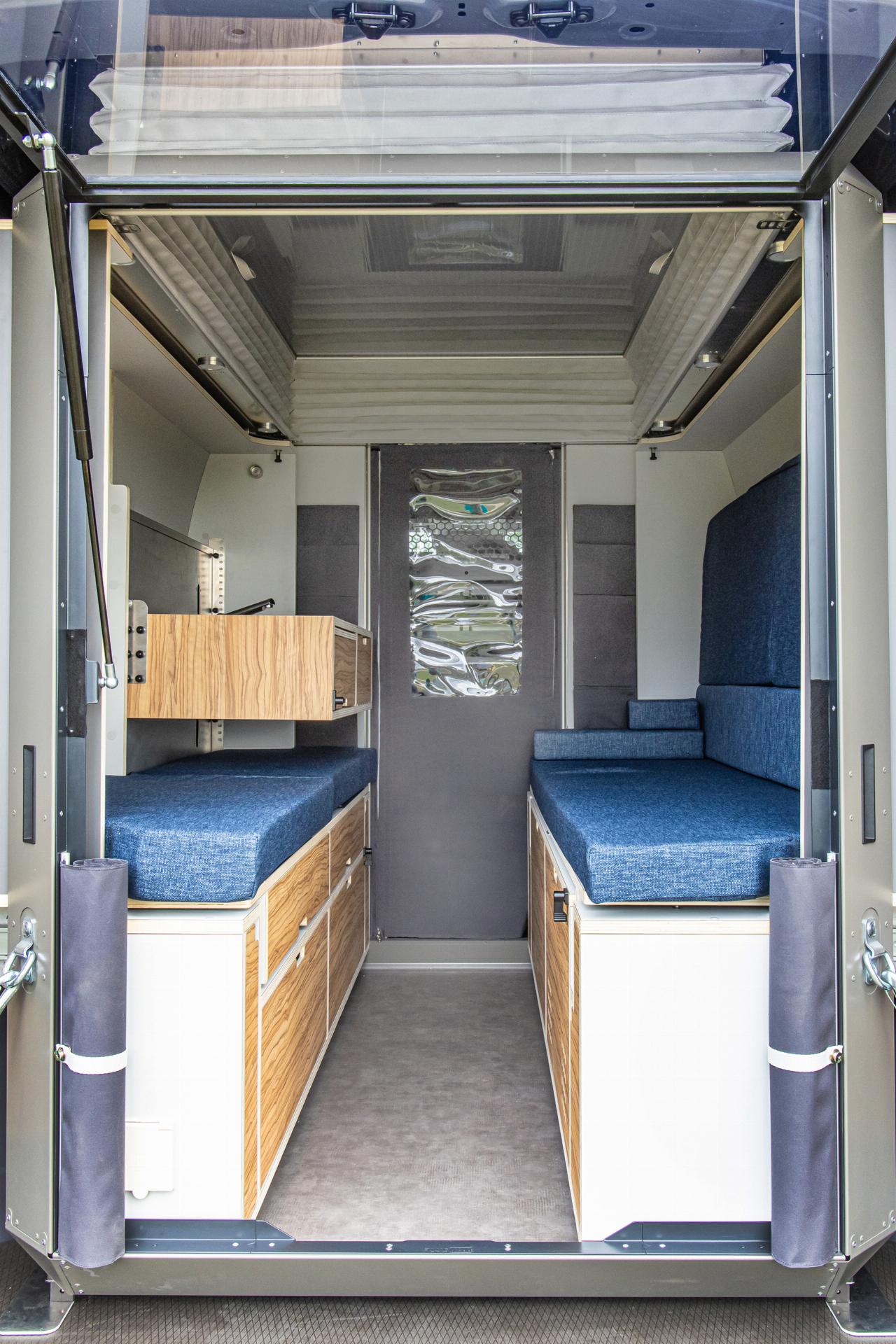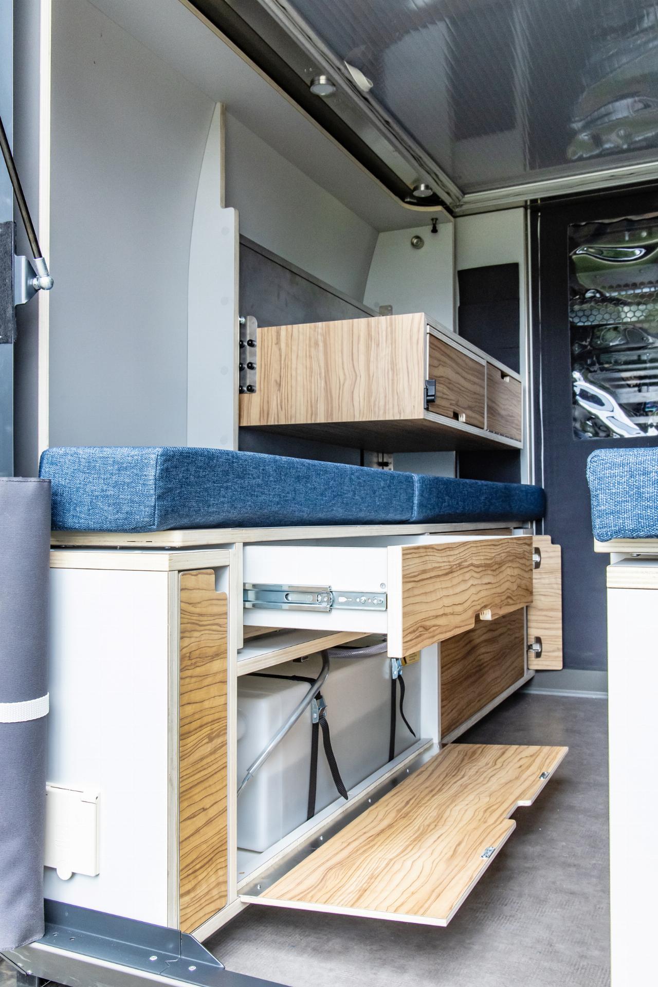 Das Wohnmodul von Plug Van bietet ein Bett für zwei Personen sowie zahlreiche Fächer und Stofftaschen, um Töpfe, Geschirr und Kleidung unterzubringen. Der Küchenblock ist höhenverstellbar und hat eine integrierte Spüle. Im Modul sind mehrere Wasseranschlüsse installiert, die sich beispielsweise dafür eignen, Geschirr zu spülen oder draußen am Heck schmutzige Schuhe abzuwaschen. Die Tanks für Frisch- und Abwasser fassen jeweils 43 Liter. Darüber hinaus gibt es zahlreiche, individuell konfigurierbare Ausstattungsmerkmale, darunter ein separates Bad-Modul, eine Kühlbox, eine größere Zusatzbatterie, ein SolarmModul. Die Farbe des Sitzpolsters sowie des Holzdekors lässt sich auswählen. Die Innenraumbeluchtung besteht aus LEDs. (aum)
