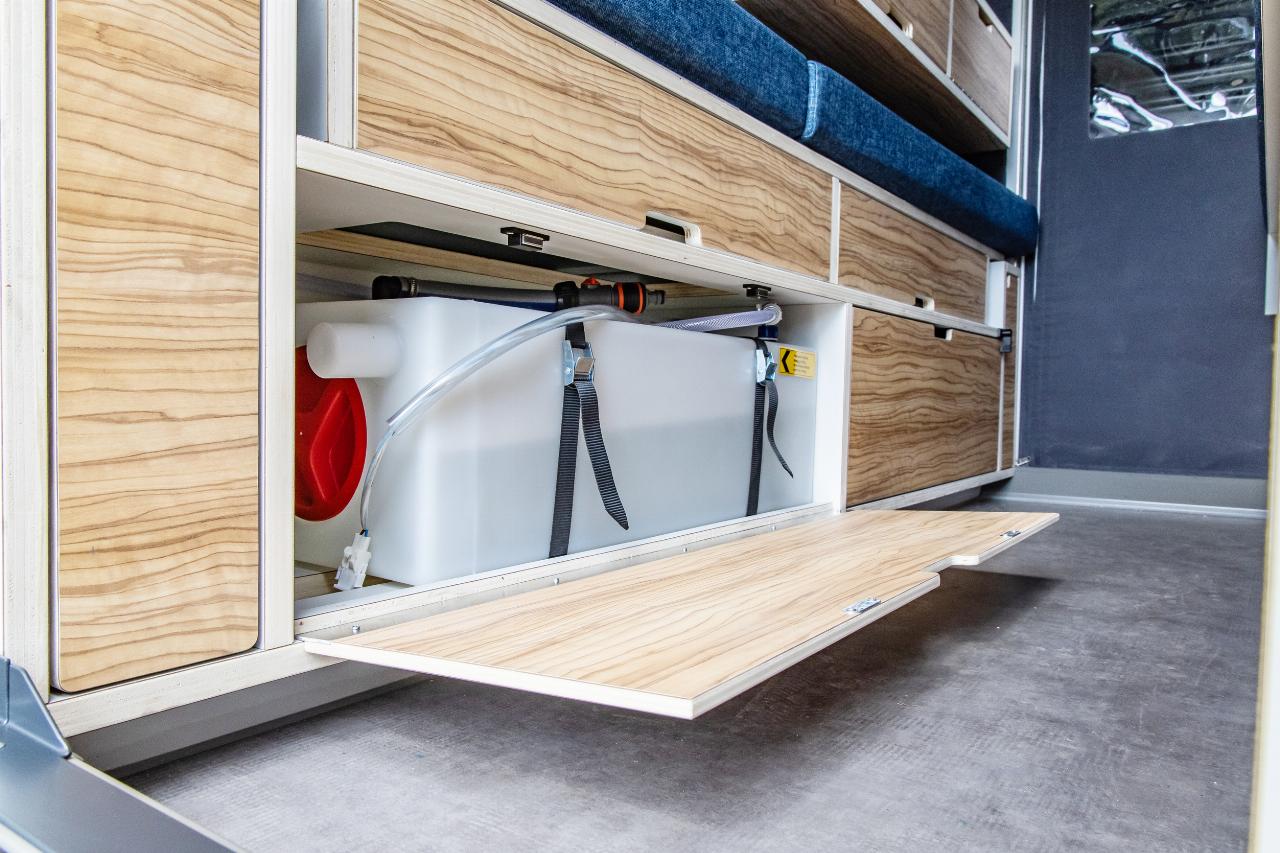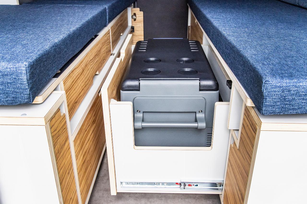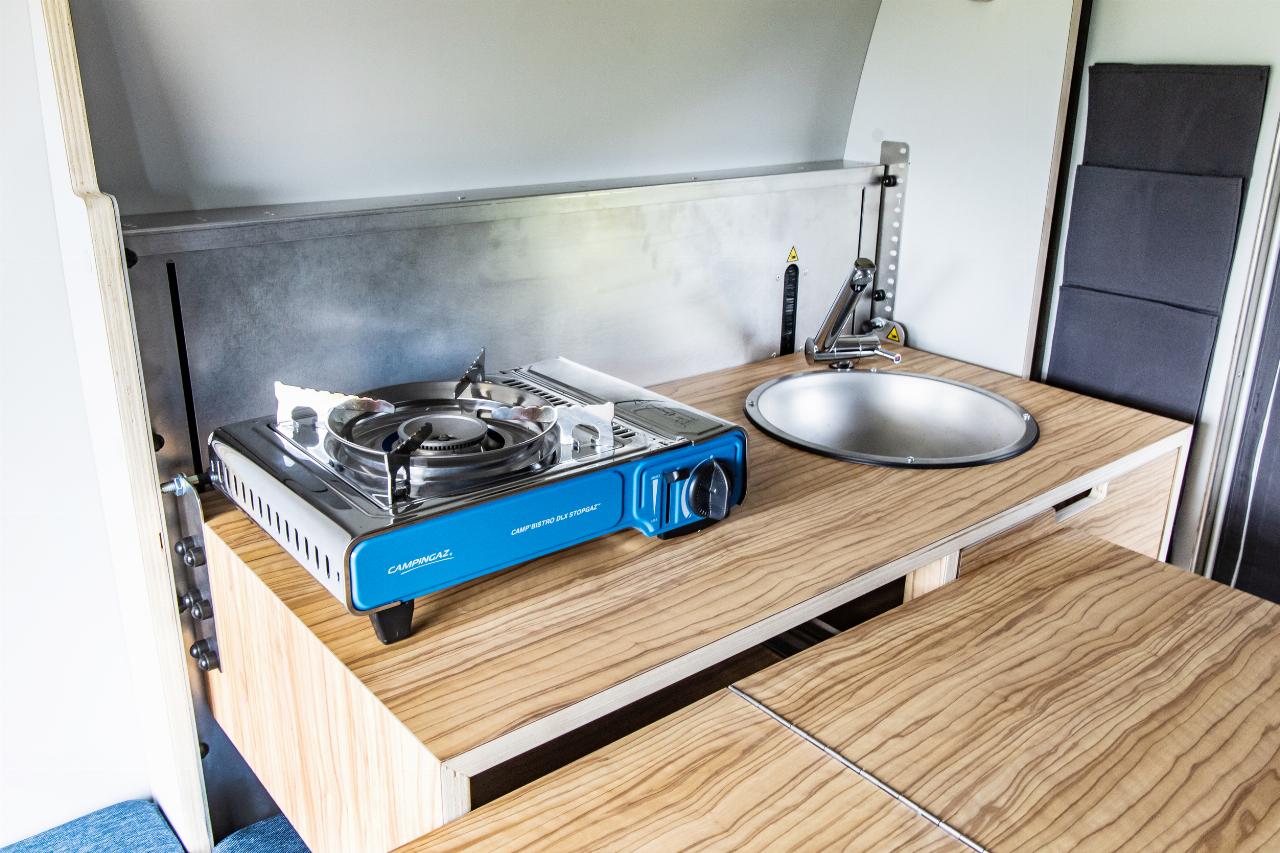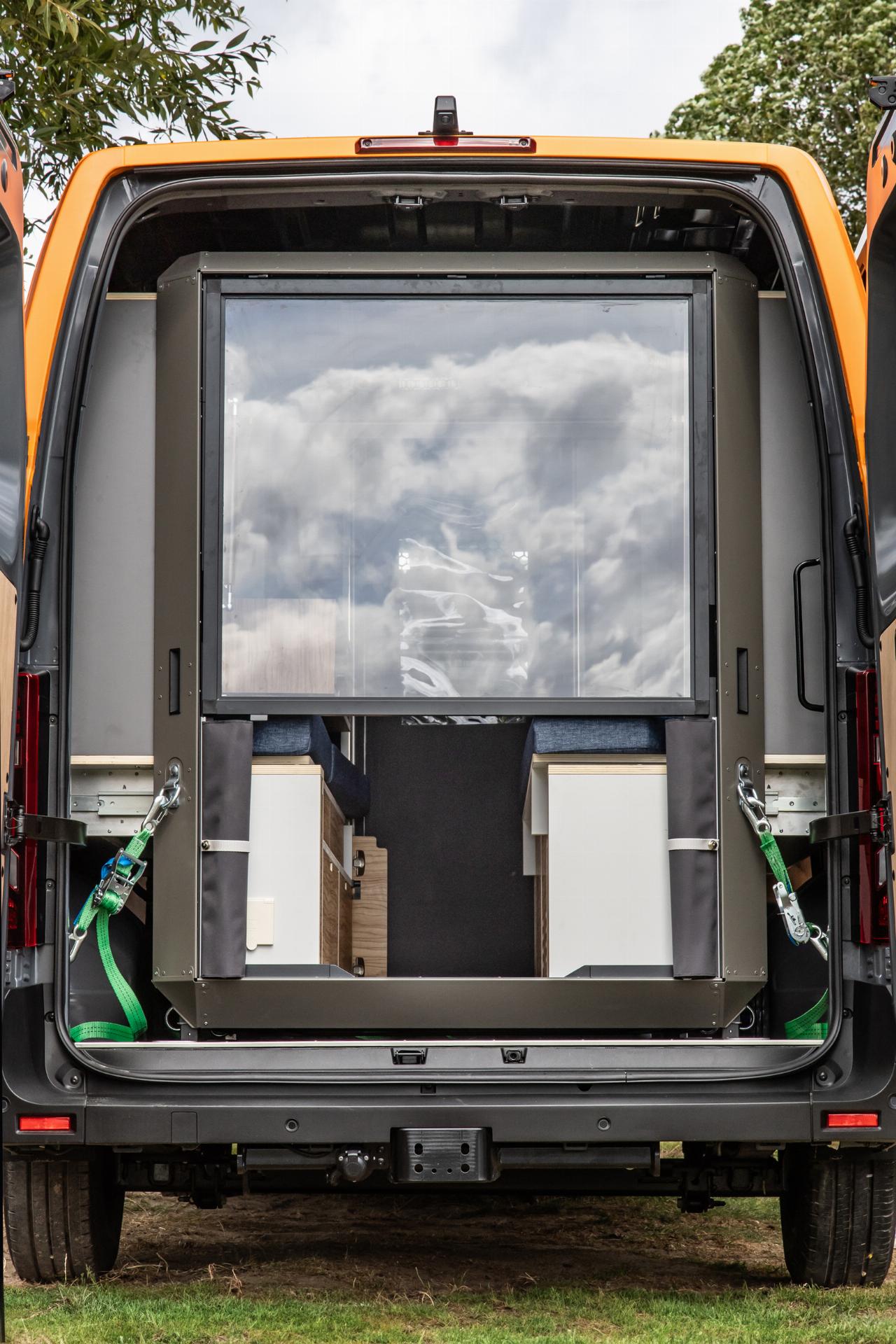 Das Wohnmodul von Plug Van bietet ein Bett für zwei Personen sowie zahlreiche Fächer und Stofftaschen, um Töpfe, Geschirr und Kleidung unterzubringen. Der Küchenblock ist höhenverstellbar und hat eine integrierte Spüle. Im Modul sind mehrere Wasseranschlüsse installiert, die sich beispielsweise dafür eignen, Geschirr zu spülen oder draußen am Heck schmutzige Schuhe abzuwaschen. Die Tanks für Frisch- und Abwasser fassen jeweils 43 Liter. Darüber hinaus gibt es zahlreiche, individuell konfigurierbare Ausstattungsmerkmale, darunter ein separates Bad-Modul, eine Kühlbox, eine größere Zusatzbatterie, ein SolarmModul. Die Farbe des Sitzpolsters sowie des Holzdekors lässt sich auswählen. Die Innenraumbeluchtung besteht aus LEDs. (aum)