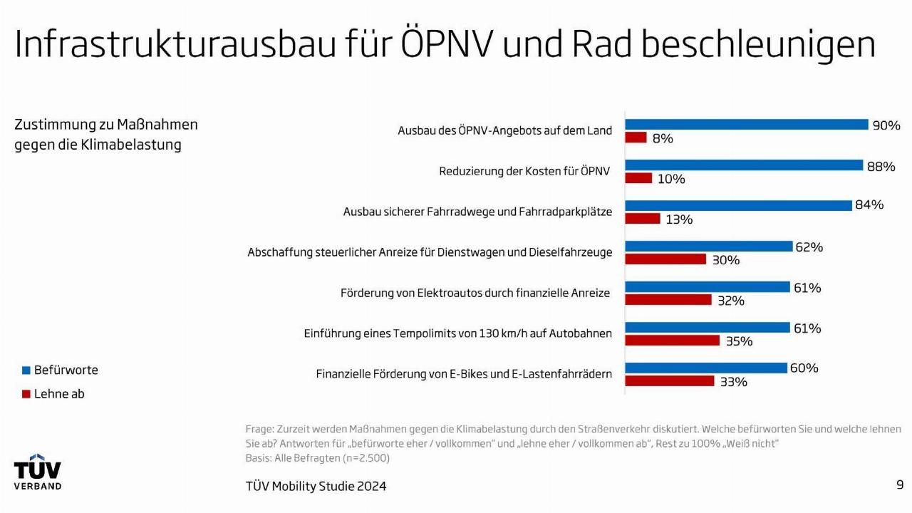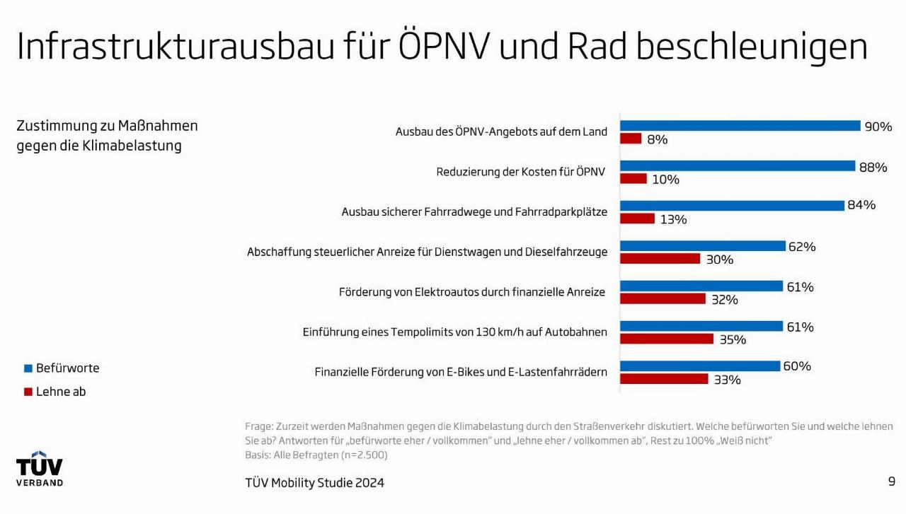 Laut der Studie sind zwei von drei Bundesbürger der Meinung, dass aufgrund der Klimabelastung ein grundsätzliches Umdenken im Bereich der Mobilität notwendig ist (69 Prozent). Die Befragten wünschen sich den Ausbau des öffentlichen Personennahverkehrs (90 Prozent), eine bessere Infrastruktur für den Zweiradverkehr (88 Prozent) oder verkehrsberuhigte Stadtviertel. Eine deutliche Mehrheit befürwortet auch Maßnahmen wie eine Abschaffung des Dienstwagenprivilegs (62 Prozent), eine stärkere Förderung der E-Mobilität (61 Prozent) oder ein Tempolimit von 130 km/h auf Autobahnen (61 Prozent).