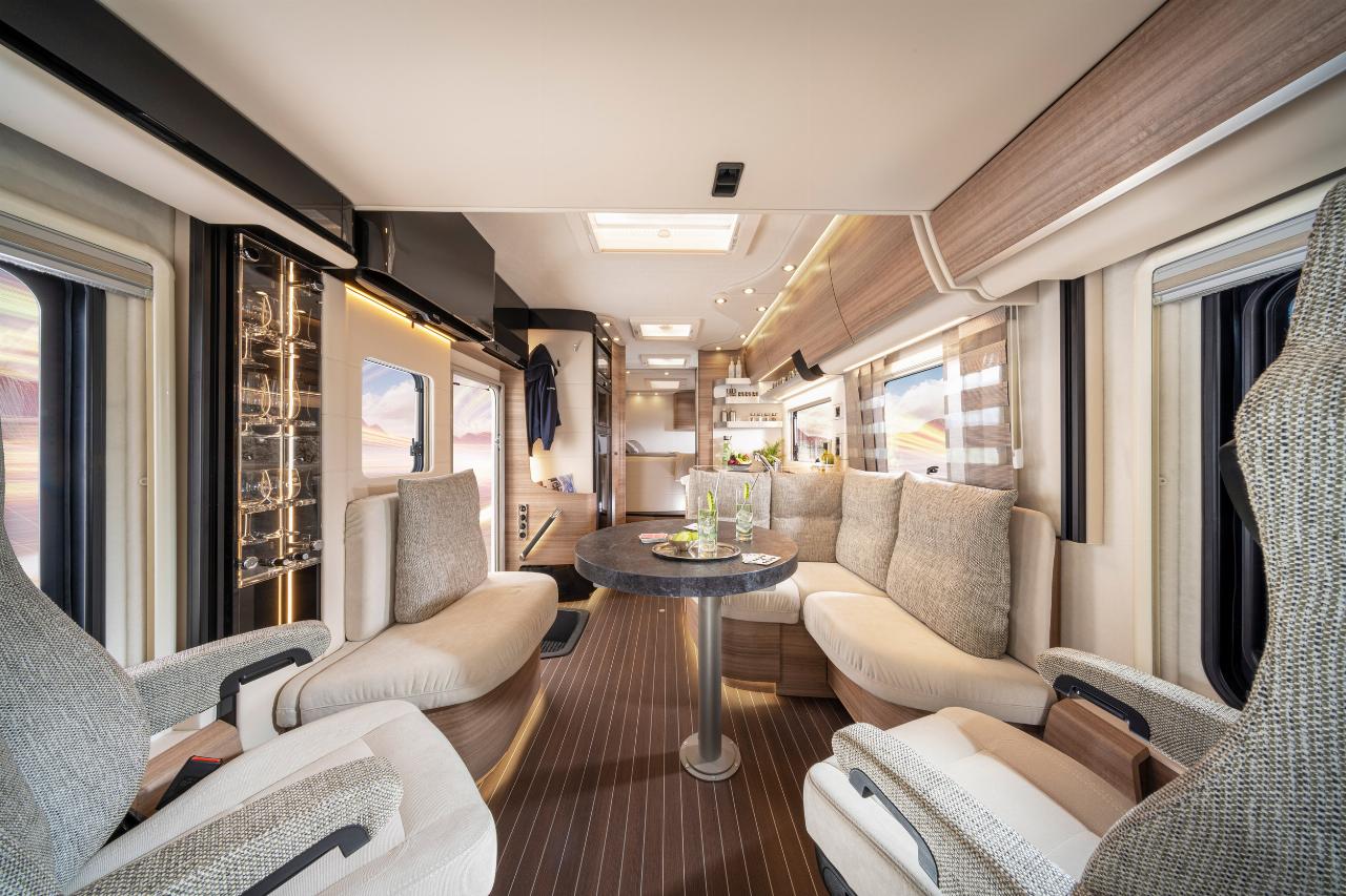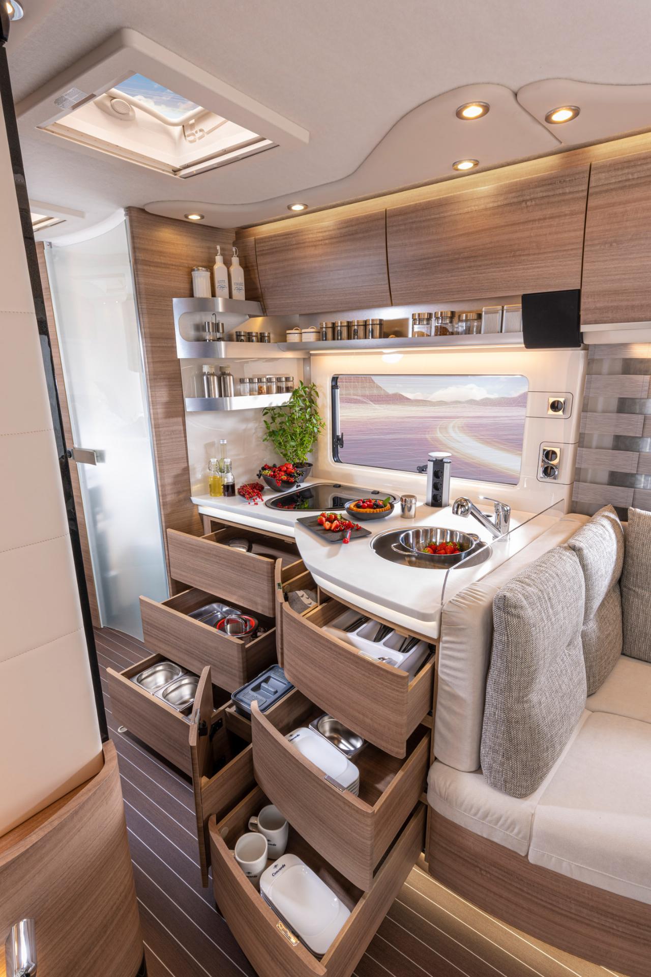 Ein Wechsel von konkav und konvex gebogenen Möbelfronten prägen die Atmosphäre im Innenraum. Helle Farbtöne für Polster und Möbelkorpus korrespondieren prächtig mit den Ebano-Silver-Furnieren der Klappen und Türen, deren Verschlüsse integriert sind und für glattflächige Formen sorgen. Die auf den ersten Blick einladende Wohnlandschaft beeindruckt mit einem ansprechenden Dekor sowie mit Polster- und Teppichstoffen, die optimal auf die Möbel abgestimmt sind. Die Küchenarbeitsfläche mit integrierter Edelstahlspüle und Einhebelmischbatterie sowie der Dreiflammkocher sind aus Mineralstoff geformt, der 177 Liter große Kühlschrank kann optional als Kompressorgerät bestellt werden. Im Küchenblock bieten ein zweiteiliger Apothekerauszug und geräumige Schubladen reichlich Stauraum für Töpfe, Teller und Vorräte.
