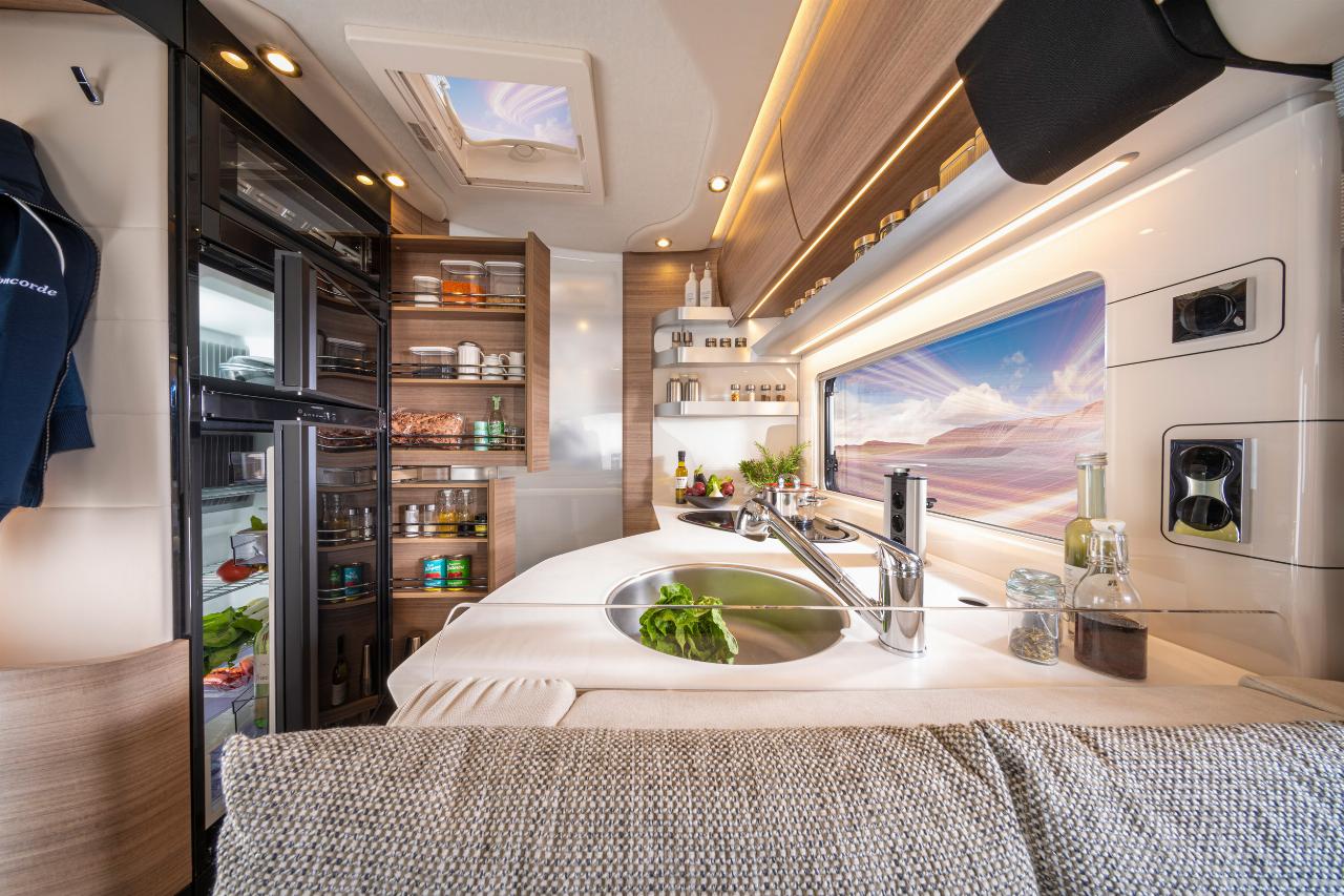 Es klingt eigentümlich, wenn die Credo-Modelle vom Hersteller als kompakte Luxusklasse bezeichnet werden, denn die Fahrzeuge sind mindestens 7,50 Meter lang und gut 2,30 Meter breit. Vier neue Grundrisse erweitern das Angebot auf insgesamt acht Versionen, alle rollen auf dem Fahrgestell des Iveco Daily mit einem 2,3-Liter-Vierzylinderdiesel und 156 PS (115 kW). Darauf baut ein neu konzipierter Doppelboden mit einem stufenfreien Innenraum auf. Fahrzeugtechnik sowie die Ver- und Entsorgungstanks sind im Doppelboden untergebracht, serienmäßig haben Frisch-, Grau- und Schwarzwassertank jeweils 160 Liter Volumen. Auf Wunsch gibt es größere Behälter mit 270 Liter Inhalt für Frischwasser und je 230 Liter für Grauwasser und Fäkalien. Autarkes Reisen steht eben hoch im Kurs. Deshalb hat Concorde auch die Dachaufteilung verändert, so dass dort neben Standklimaanlage und Satellitenschüssel bis zu fünf Solarpanels mit einer Leistung von rund 700 Watt installiert werden können.