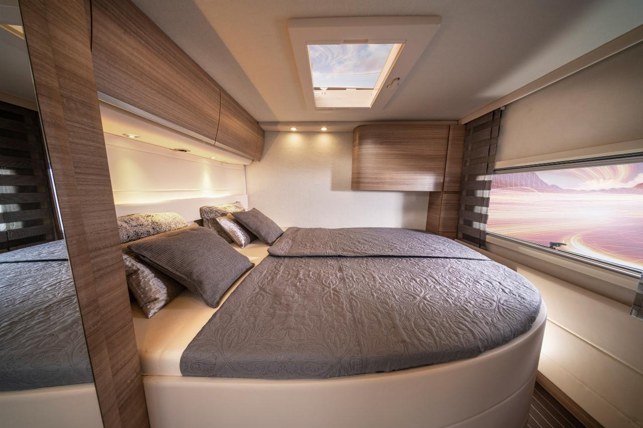 Im Schlafzimmer geht es nicht minder großzügig zu. Selbst das Querdoppelbett im Credo 740 HI hat eine Fläche von 200 mal 150 Zentimetern, die Einzelbetten im 790 LI sind jeweils 200 mal 100 Zentimeter groß. Geschlafen wird auf einer Kombination aus Lattenrost und Evopore-HRC-Komfortschaummatratze mit Water-Gel-Kern. Bei Bedarf taugt die Kuschelwiese auch als Heimkino: ein 24 Zoll großes Smart-TV Gerät und ein Akustik-Paket mit Vierkanal-Verstärker sorgen für scharfe Bilder und den guten Ton.