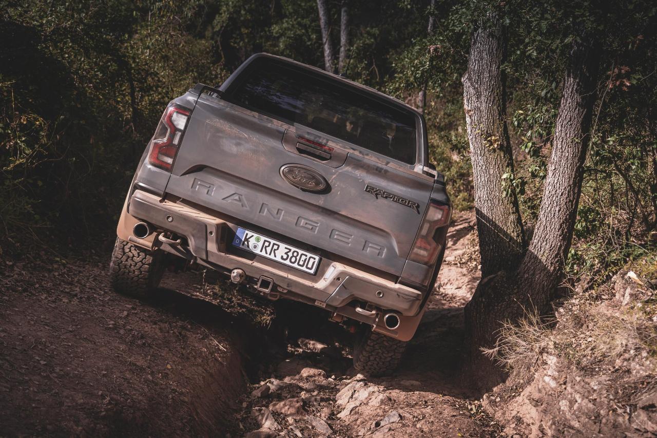 Dass der Raptor kein Spielzeug für abenteuersuchende Großstadtbürger sein will, zeigt er mit seinem Auftritt. Das Design mit den weit ausgestellten Radhäusern und die C-förmigen LED-Scheinwerfer zusammen mit der wuchtigen Frontpartie samt dem unübersehbaren Ford-Schriftzug, den ausladenden Trittleisten und die großzügig bemessene Bodenfreiheit zeigen in Richtung Gelände. Also hinein in die unbefestigte Welt. Auch der unerfahrene Geländepilot fühlt sich bald als „King of the Trails“, denn den Raptor kann scheinbar nichts aus der Ruhe bringen.