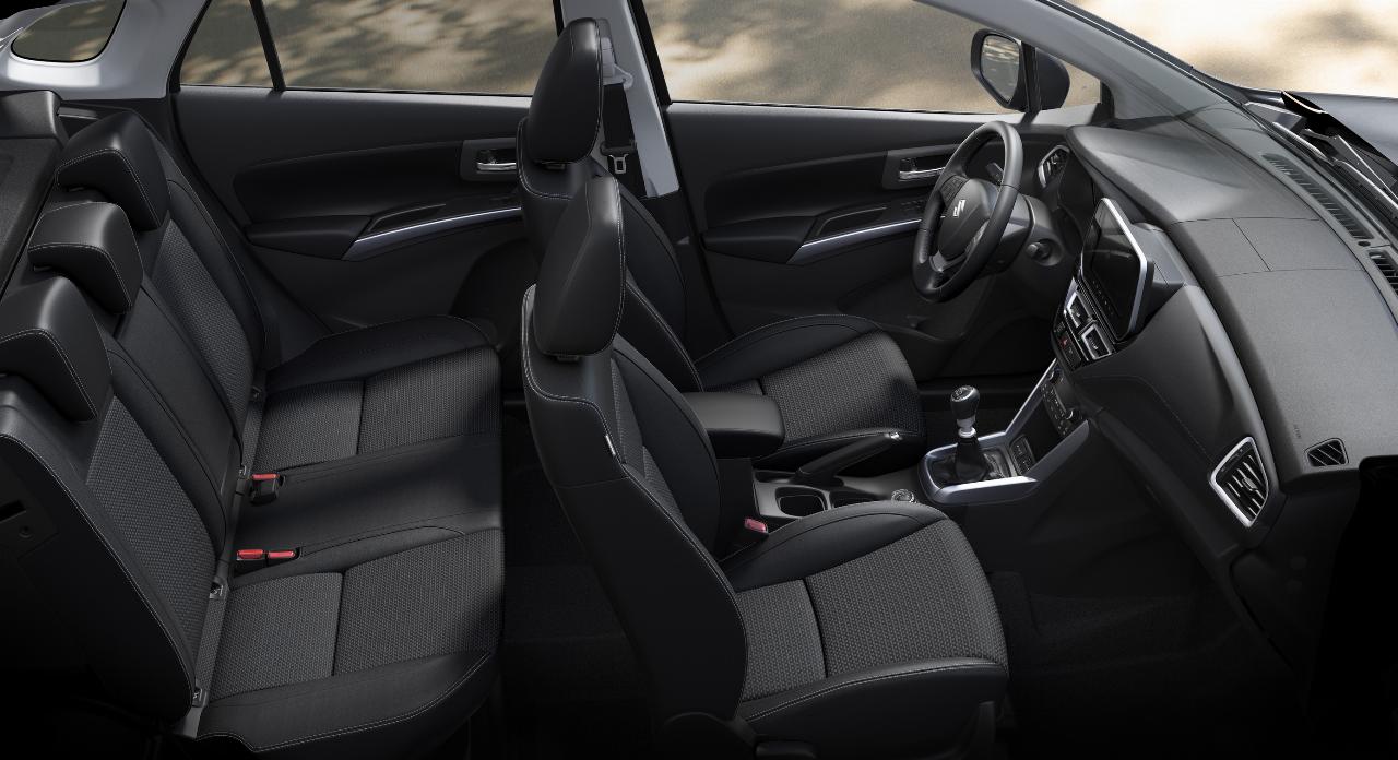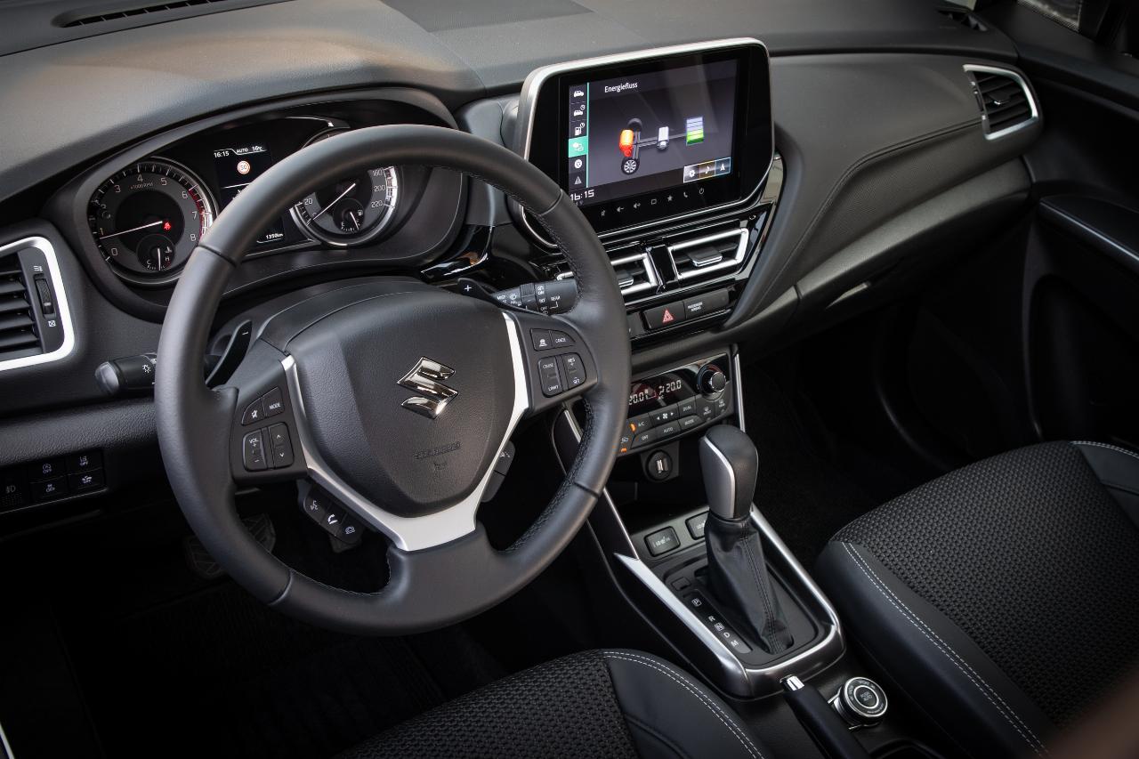 Deutlich zeitgemäßer und leichter zu handhaben sind Cockpit und Armaturentafel mit dem neuen Audiosystem, das statt des integrierten nun einen frei stehenden und höher plazierten Multimedia-Touchscreen besitzt. In der Basisausstattung Comfort nur als 7-Zoll-Display, ist er in der Version Comfort+ als hochauflösender 9-Zoll-Bildschirm ausgeführt, über den sich Bord-, Fahr- und Audio-Infos abrufen lassen wie auch Navigationshinweise und Bilder der 360-Grad-Kamera angezeigt werden können. Während die beiden letztgenannten Features der Topversion vorbehalten bleiben, ist das neue Fahrassistenz- und Sicherheits-Paket in allen S-Cross serienmäßig verbaut. Dazu zählen vom adaptiven Tempomat mit Stop&Go-Funktion über einen Toter-Winkel-, Müdigkeits- und Kollisionswarner mit Notbremse bis zum Spurhaltewarnsystem mit Lenkeingriff, Ausparkassistent und Verkehrszeichenerkennung vieles, was in der Klasse längst nicht überall zur Werksausrüstung gehört. Das gilt ebenso für die kabellose Smartphone-Integration via Apple CarPlay und Android Auto.