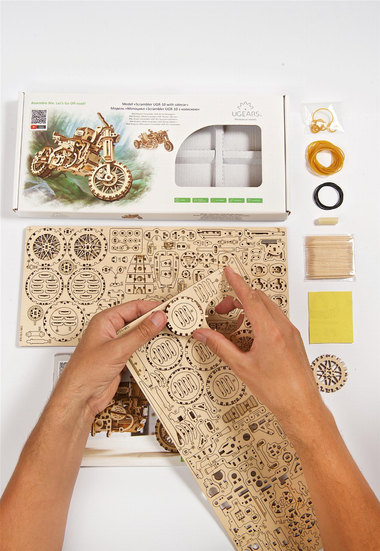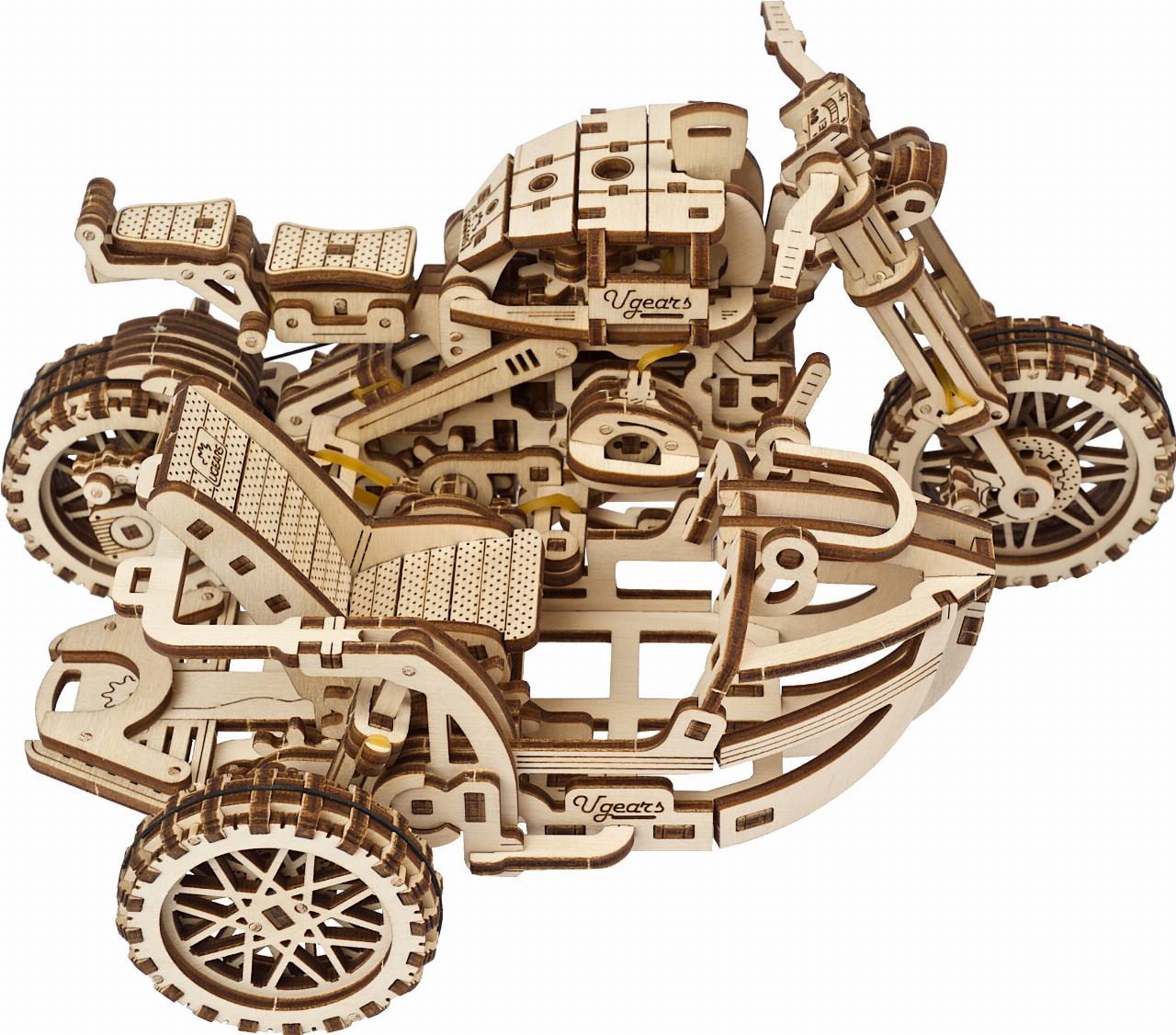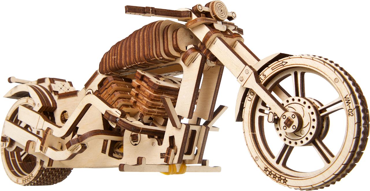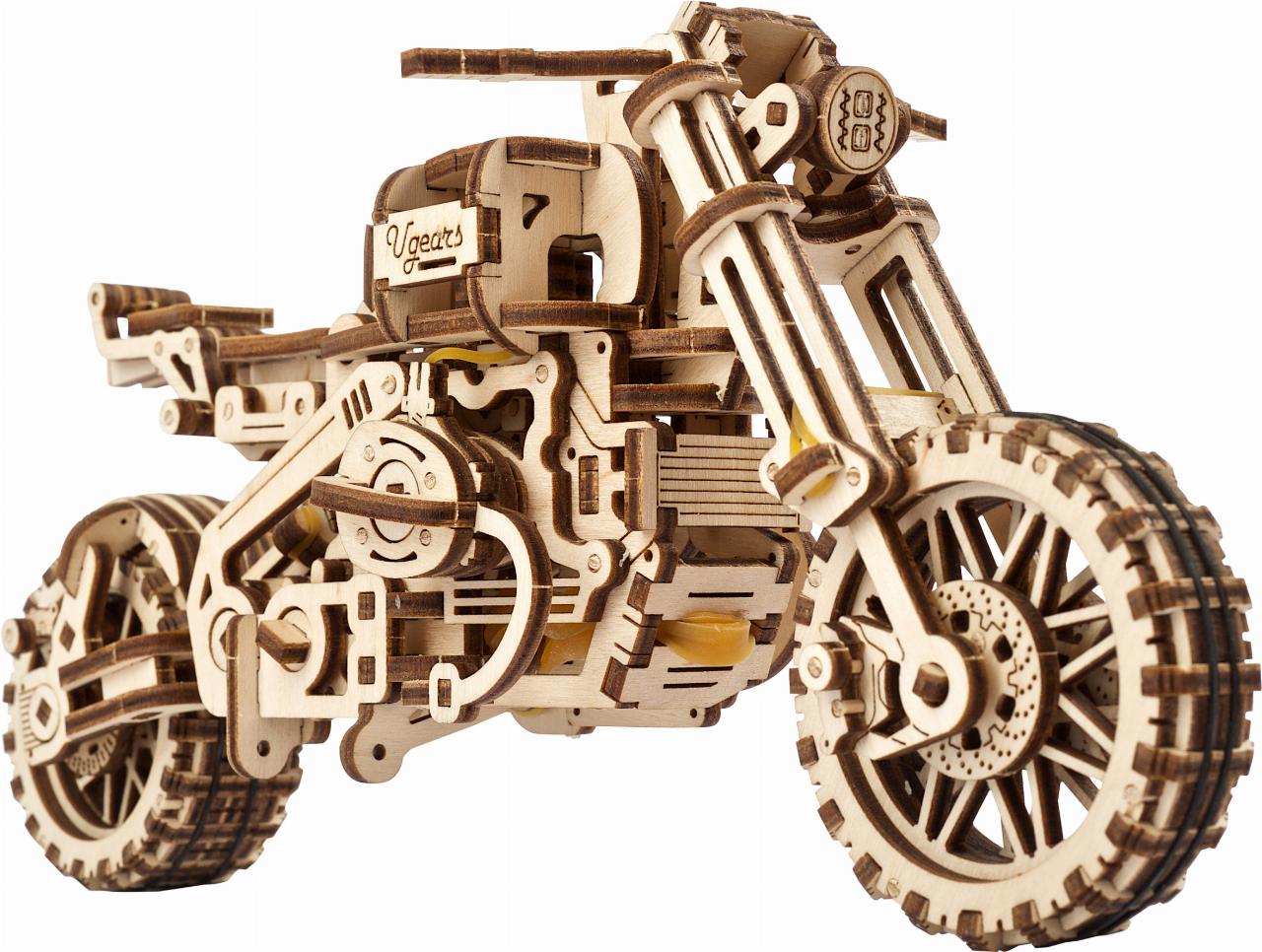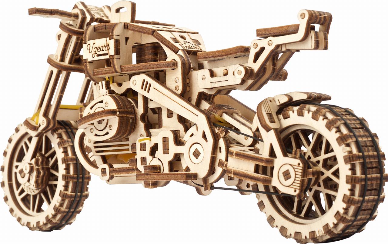 Als Überbrückungshilfe im Winter bietet die Firma Louis für Biker einen besonderen Modellbausatz an. Er stammt von der ukrainischen Firma Ugears und setzt sich aus 380 Holzteilen zusammen, wobei für den Zusammenbau kein Kleber gebraucht wird. Die Teile werden zusammengesteckt oder mit Gummibändern zusammengehalten, die an anderer Stelle auch als Federung und Antriebsriemen dienen.