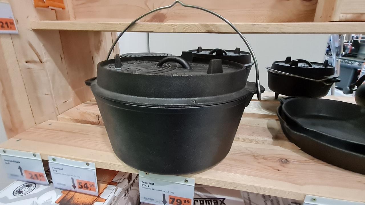 Für Camper ist zu beachten: Der Dutch Oven wird aus schwerem Gusseisen gefertigt, ein 12 Zoll großer Feuertopf bringt locker 10 Kilogramm auf die Waage. Dazu kommt noch der Deckel. Wichtig ist das Einbrennen des Topfes: Im Backofen wird er bei 200 Grad und mit einer feinen Schicht Speiseöl überzogen, auf den zukünftigen Einsatz vorbereitet. Mit Wasser sollte er danach nie mehr gereinigt werden, denn Gusseisen rostet. Die Preise liegen, in Abhängigkeit von der Größe, zwischen 40 und 100 Euro. Zu haben sind sie in der Grillabteilung des Baumarkts oder bei Petromax oder BBQ-Toro. (mk)