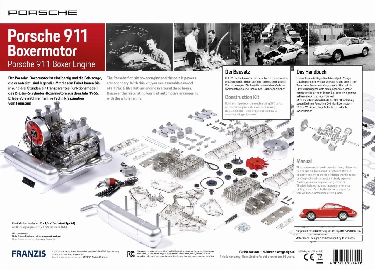 Dieser Miniaturbausatz des legendären Porsche Sechszylinder-Boxermotors dürfte nicht nur Fans der Stuttgarter-Sportwagenschmiede begeistern. Dabei ist die Montage des detailgetreuen Zweiliter-Motors aus dem Porsche 911 von 1966 überhaupt nicht schwierig. Der aus über 290 Teilen bestehende Bausatz wird ohne den Einsatz von Klebstoff einfach zusammengesteckt und verschraubt. Nach gut drei Stunden erhält man ein transparentes Motorenmodell im Maßstab 1:4, bei dem sich alle Teile wie beim großen Vorbild bewegen. So öffnen und schließen sich die Ventile, während die Kolben auf- und abwandern und die Kurbelwelle rotiert. Die Zündfunken in den Zylindern werden mit LEDs simuliert und für den originalgetreuen Motorsound sorgt ein kleiner Lautsprecher. Erhältlich ist der detailgetreue Funktionsmotor bei www.franzis.de für 199 Euro. (gb)