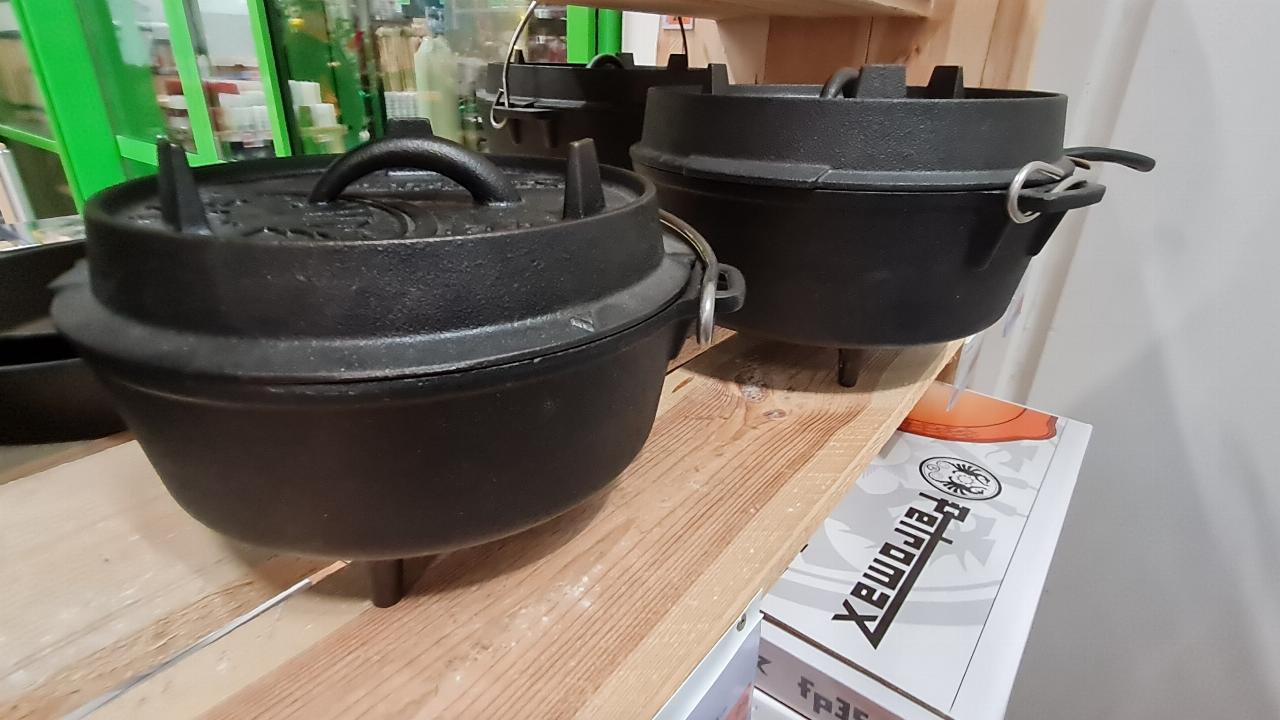 Der Dutch Oven oder auch Feuertopf, einst von europäischen Auswanderern auf nahezu alle Kontinente exportiert, ist universell einsetzbar. Die Cowboys garten ihre Bohnen in ihm, die Buren Lamm und Gemüse. Der Vorteil des schwarzen und nahezu unverwüstlichen Kochgeschirrs: dank dreier Füße am Boden kann er mitten in die Glut des Lagerfeuers gestellt werden. Ist mehr Hitze erwünscht, kann die Kohle zusätzlich auf den Deckel gelegt werden. Das Kochen ist einfach, Schmorgerichte gelingen immer. Profis grillen damit sogar.
