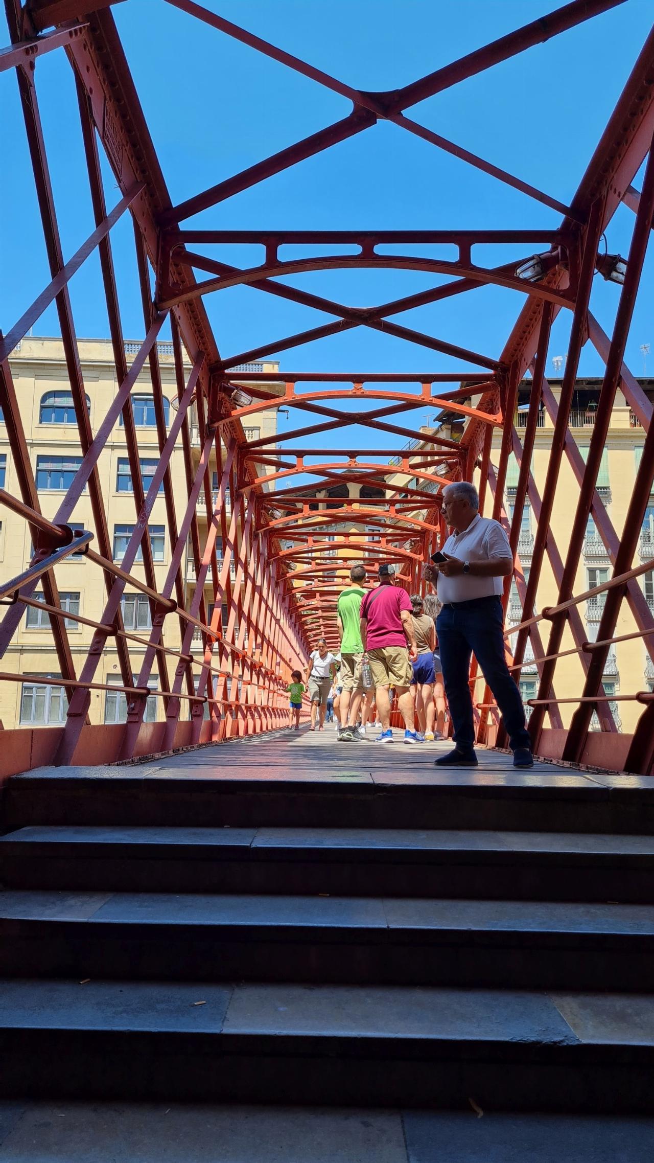 Der Fluss Onyar teilt Girona in zwei Hälften und verläuft vorbei am alten Fischerviertel, dessen farbenfrohe Häuser heute zu den angesagtesten Domizilen gehören. Eine der zahlreichen Brücken, die ihn überqueren, ist der Fußgängersteig Pont de les Peiscateries Velles und der wurde, jetzt begegnen wir ihm ein zweites Mal auf unserer Reise, 1877 von Gustave Eiffel, dem Mann des Eisens, konstruiert. Gekostet hat sie damals nur 22.500 Peseten, dafür steht sie noch heute solide und sicher auf ihren Fundamenten.