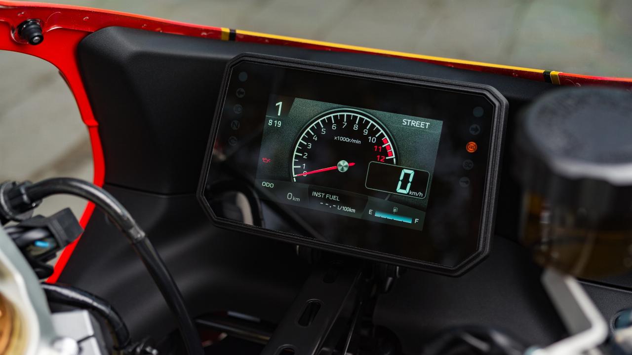 In dem Cockpit im Retro-Stil ist ein neues Fünf- Zoll-TFT-Farbdisplay mit vier wählbaren Anzeigemotiven untergebracht, darunter auch eines mit einem analog anmutenden Drehzahlmesser.
