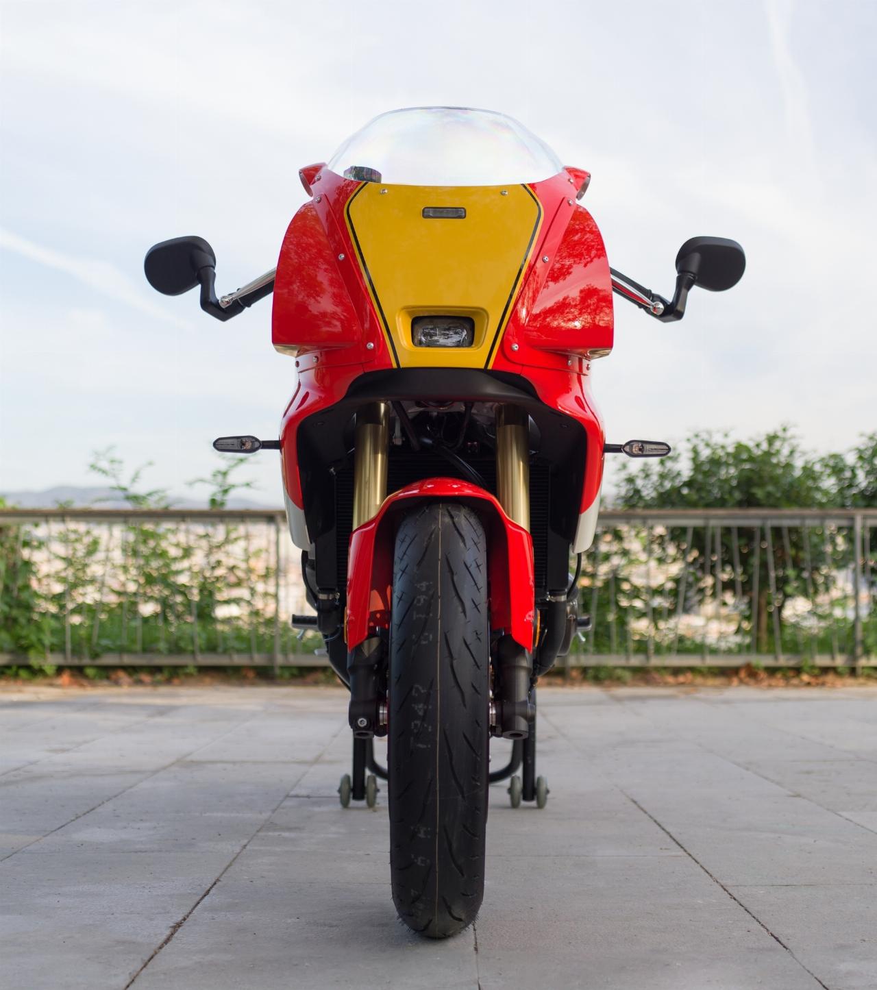 Um den Racing-Look beizubehalten, wurde der runde LED-Scheinwerfer der XSR durch ein kompaktes Linsenmodul ersetzt, das hinter der Verkelidung sitzt. Die Rohrstruktur, die die Frontverkleidung mit dem Rahmen verbindet, und die geraden Halterungen, die das Cockpit stützen, schaffen eine Fahrerperspektive, die ebenfalls von jener Zeit inspiriert sind. Über den Soziussitz findet sich eine farblich passende Abdeckung als Sitzhöcker, in dem sich auch das Rücklicht „versteckt“.