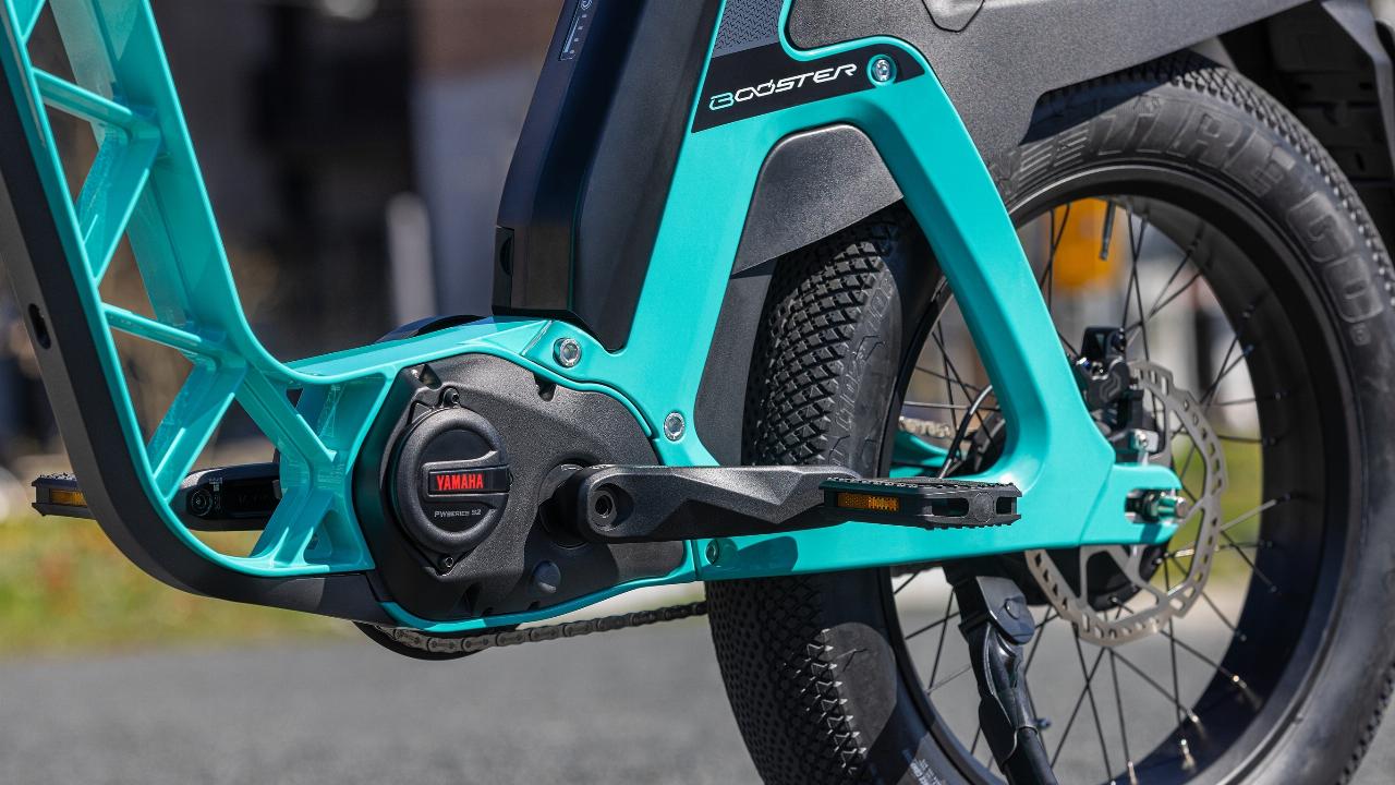Den Antrieb übernimmt in beiden Fällen der bekannte PW S2, der 75 Newtonmeter Drehmoment liefert. Die 36-Volt-Batterie hat eine Kapazität von 630 Wh und steckt nicht im Unter-, sondern am Sitzrohr. Das Booster rollt auf dicken 20x4-Zoll-Rädern. Yamaha verspricht je nach Fahrmodus (darunter auch eine automatisch arbeitende Stufe) Reichweiten von bis zu 60 und 120 Kilometern. Neben dem luftigen Rahmenrohr (alternativ gibt es im Zubehör auch Blenden) fallen auch die mächtigen Schutzbleche auf.