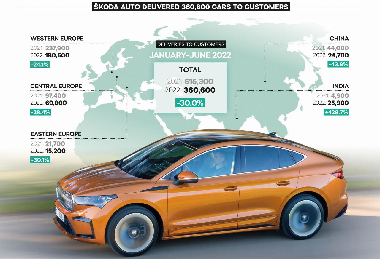 In den ersten sechs Monaten des Jahres liefert der tschechische Automobilhersteller weltweit 360.600 Fahrzeuge an Kunden aus. Dies entspricht einem Minus von 30,0 Prozent gegenüber dem Vergleichszeitraum des Vorjahres (Januar bis Juni 2021: 515.300 Fahrzeuge). In Westeuropa gehen die Auslieferungen von Januar bis Juni um 24,1 Prozent auf 180.500 Fahrzeuge zurück (Januar bis Juni 2021: 237.900 Fahrzeuge). In Deutschland, seinem weltgrößten Einzelmarkt, verzeichnet das Unternehmen einen Rückgang der Auslieferungen an Kunden um 16,4 Prozent gegenüber dem Vorjahr auf 63.500 Fahrzeuge (erstes Halbjahr 2021: 75.900 Fahrzeuge).