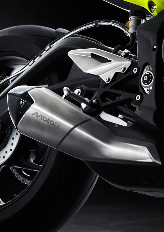 Bei der Moto 2 widerum sind die Seiten, der vordere Kotflügel, die Bugverkleidung und die Endkappe des Schalldämpfers aus gewichtssparendem Karbon gefertigt. Der Sitz des Editionsmodells hat eine „Moto 2“-Prägung und einem extra-griffigen Bezug. Weitere Merkmale sind ein neues, klares Rücklicht sowie ein lasergraviertes „Moto 2“-Logo auf dem Auspuffendrohr. Die auffällige Farbgebung in Mineral Grey und Crystal White wird durch einen Heckrahmen und Akzente in leuchtendem Gelb und einen passenden Streifen auf dem Hinterrad ergänzt. Die individuelle Fertigungsnummer findet sich auf der gefrästen oberen Gabelbrücke, die ebenfalls das Moto-2-Logo trägt, das auch auf dem Startbildschirm des TFT-Displays auftaucht.