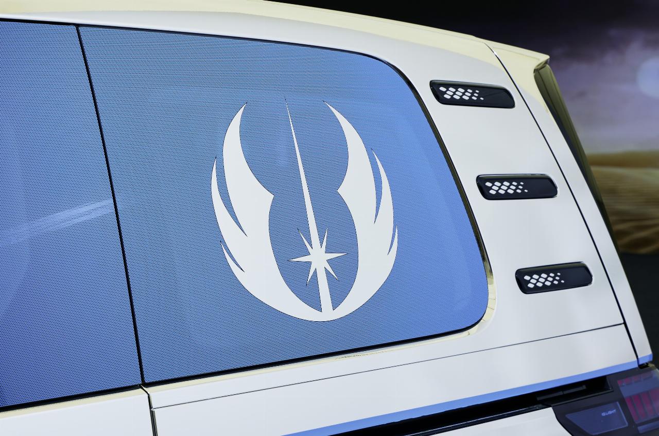 Der untere Teil der „Light Side Edition“ ist in Beige gehalten, inspiriert vom Farbton der Tunika von Obi-Wan Kenobi. Das glänzende Chrom im oberen Bereich verweist auf das Design von Raumschiffen und Droiden aus dem Star-Wars-Universum. Eine blaue Linie an der Seite, die sich bis zur Front in die Scheinwerfer und den Lichtstreifen fortsetzt, symbolisiert Obi-Wans blaues Lichtschwert. Die Glasflächen des ID Buzz sind passend dazu in transparentem Blau gestaltet und harmonieren mit der eigens entwickelten Unterbodenbeleuchtung. Logos der Rebel Alliance finden sich auf den Seitenscheiben sowie auf den Nabendeckeln der Felgen mit ihren indvidualisierten 21-Zoll-Rädern.