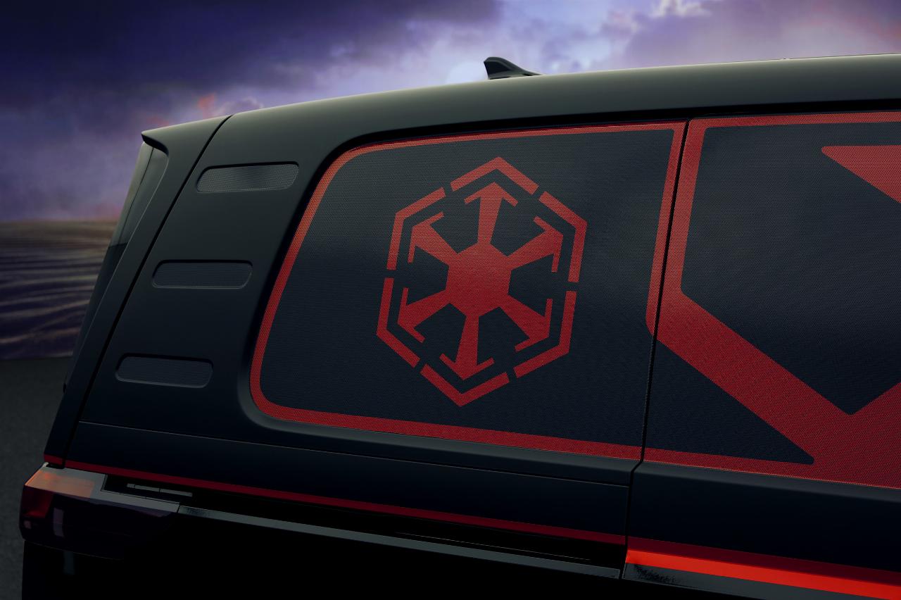 Basis der „Dark Side Edition” ist der ID Buzz Cargo. Düstere Schwarz- und Rottöne verkörpern die dunkle Seite der Macht. Die Folie ist im unteren Bereich des Fahrzeugs Schwarz glänzend, während der obere Teil des Fahrzeugs in mattem Schwarz gestaltet wurde ist. Seitenlinien, Scheinwerfer, Lichtleisten und Fensterflächen sind in einem kräftigen Rot gehalten, inspiriert von Darth Vaders Lichtschwert. Dazu kommt eine rote Unterbodenbeleuchtung. Die Nabendeckel der ebenfalls eigenständig gestalteten 21-Zoll-Felgen und die Karosserie tragen das Logo des Imperiums.